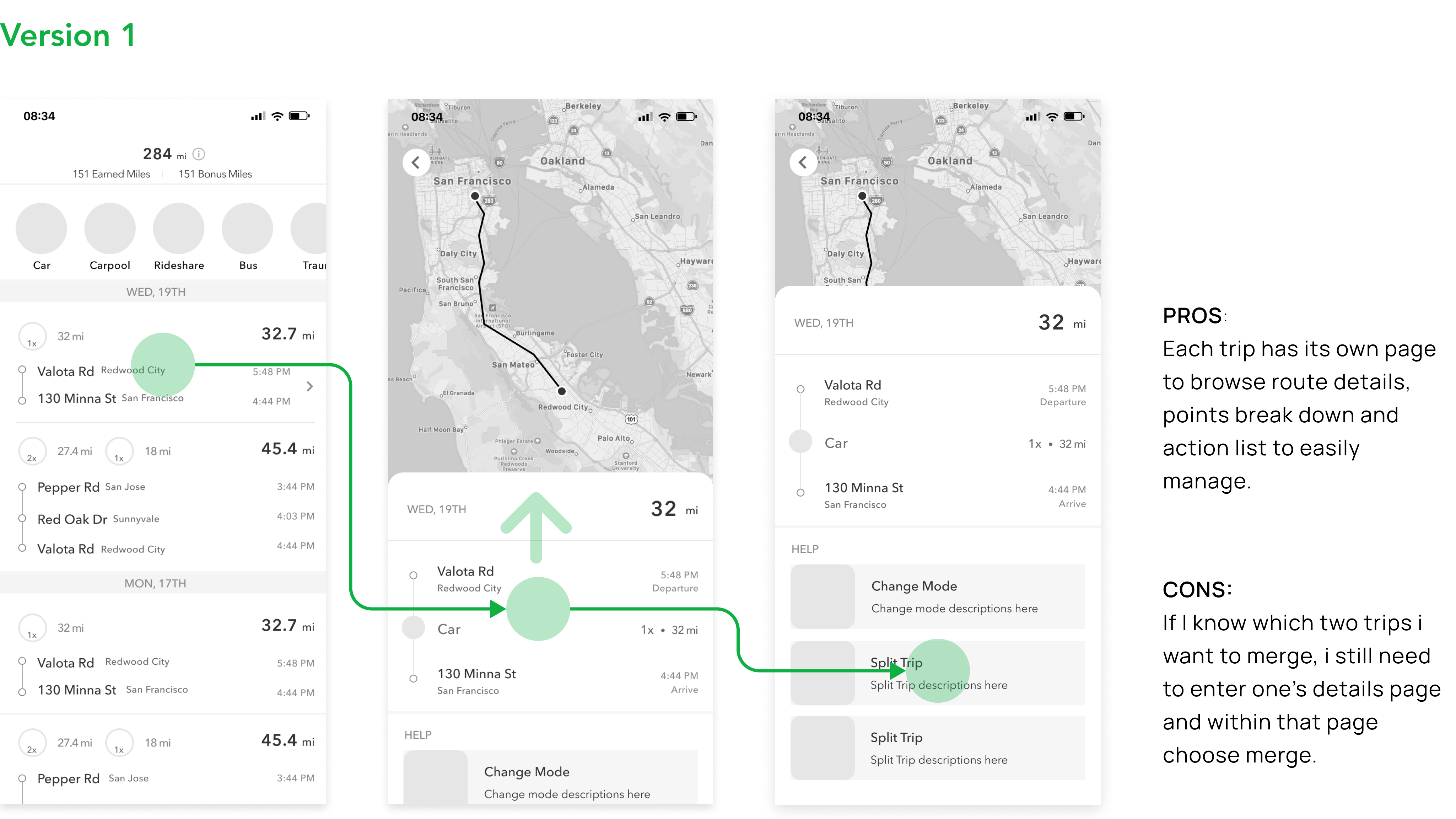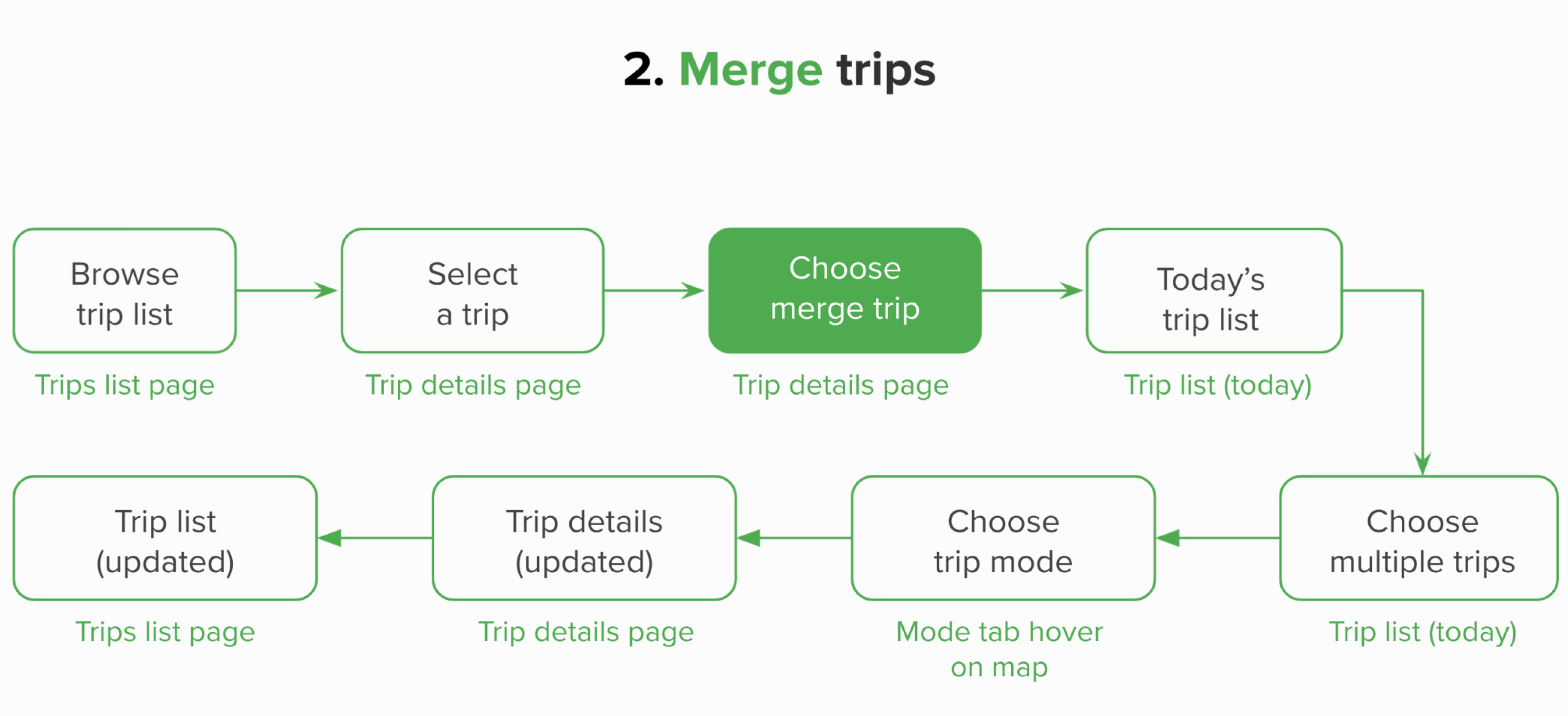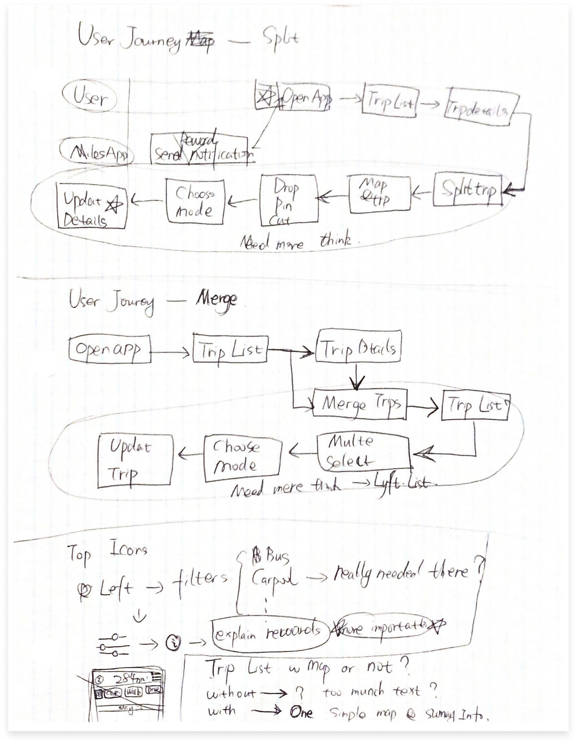 1. From this design challenge, I wanted to help users easily and effectively manage the trips and get better rewarded. I thought by improving the splitting and merging experiences will improve the entire trip experience section and better interact with users that Miles's user base and goals.