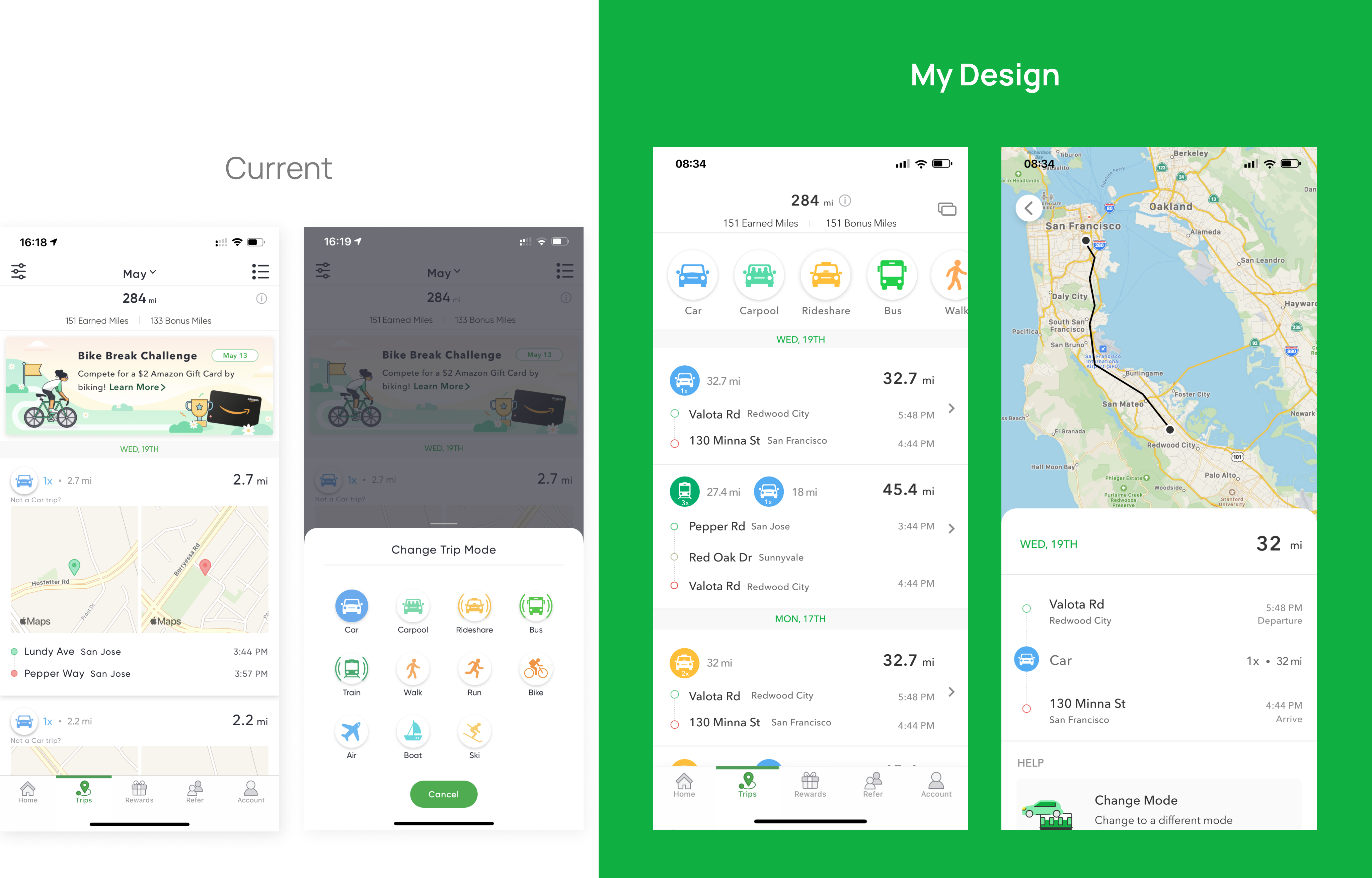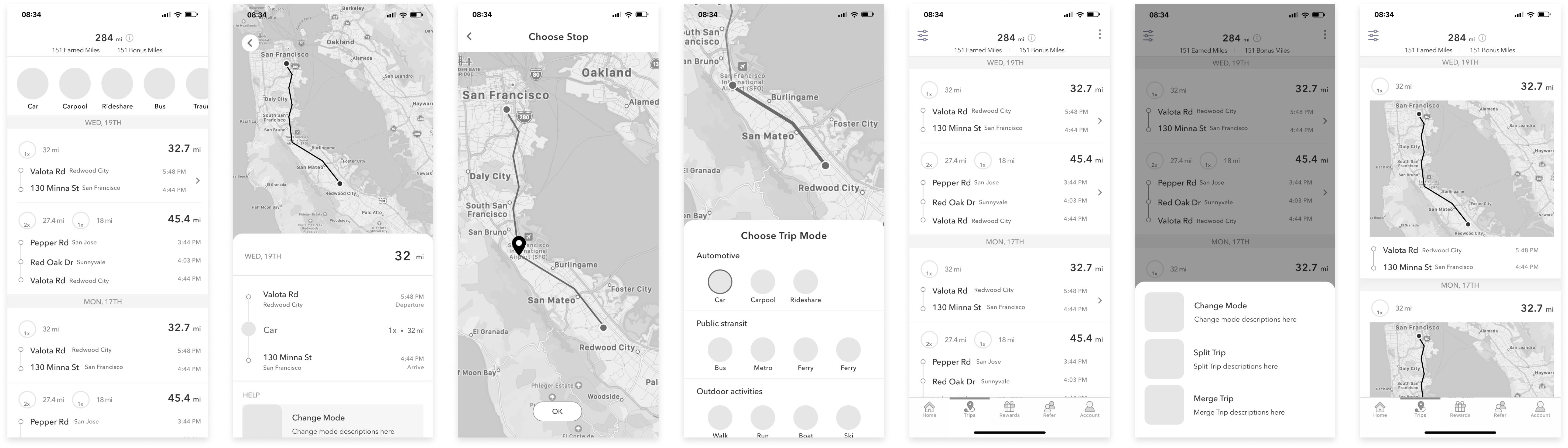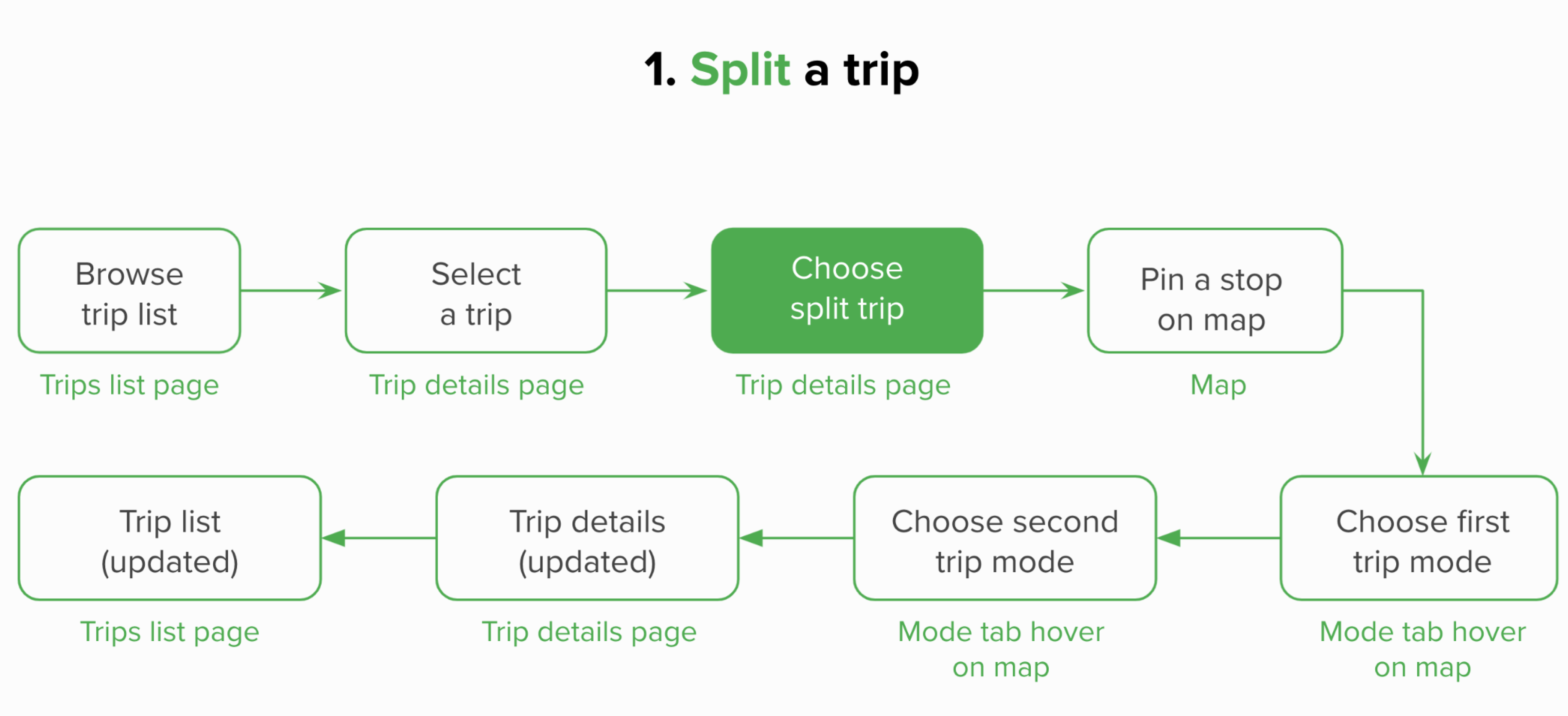 1. From this design challenge, I wanted to help users easily and effectively manage the trips and get better rewarded. I thought by improving the splitting and merging experiences will improve the entire trip experience section and better interact with users that Miles's user base and goals.