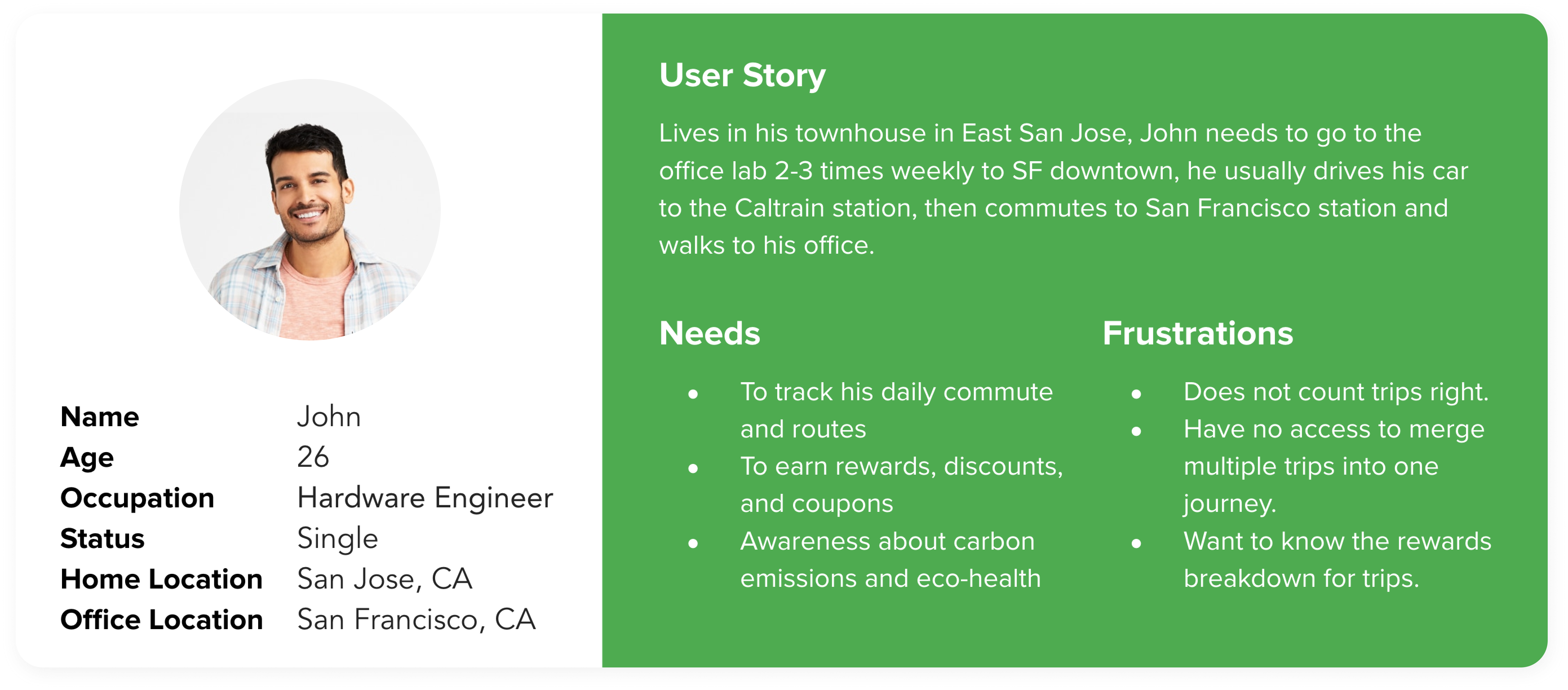 Referred 5 to my friends who have similar behaviors about trips to install Miles and asked them to freely browse and track using the app. Most of the test participants haven't heard of Miles, but very interested in the rewards and the business. After this, I created a persona John to represent our target userās demographics, needs, and pain points.