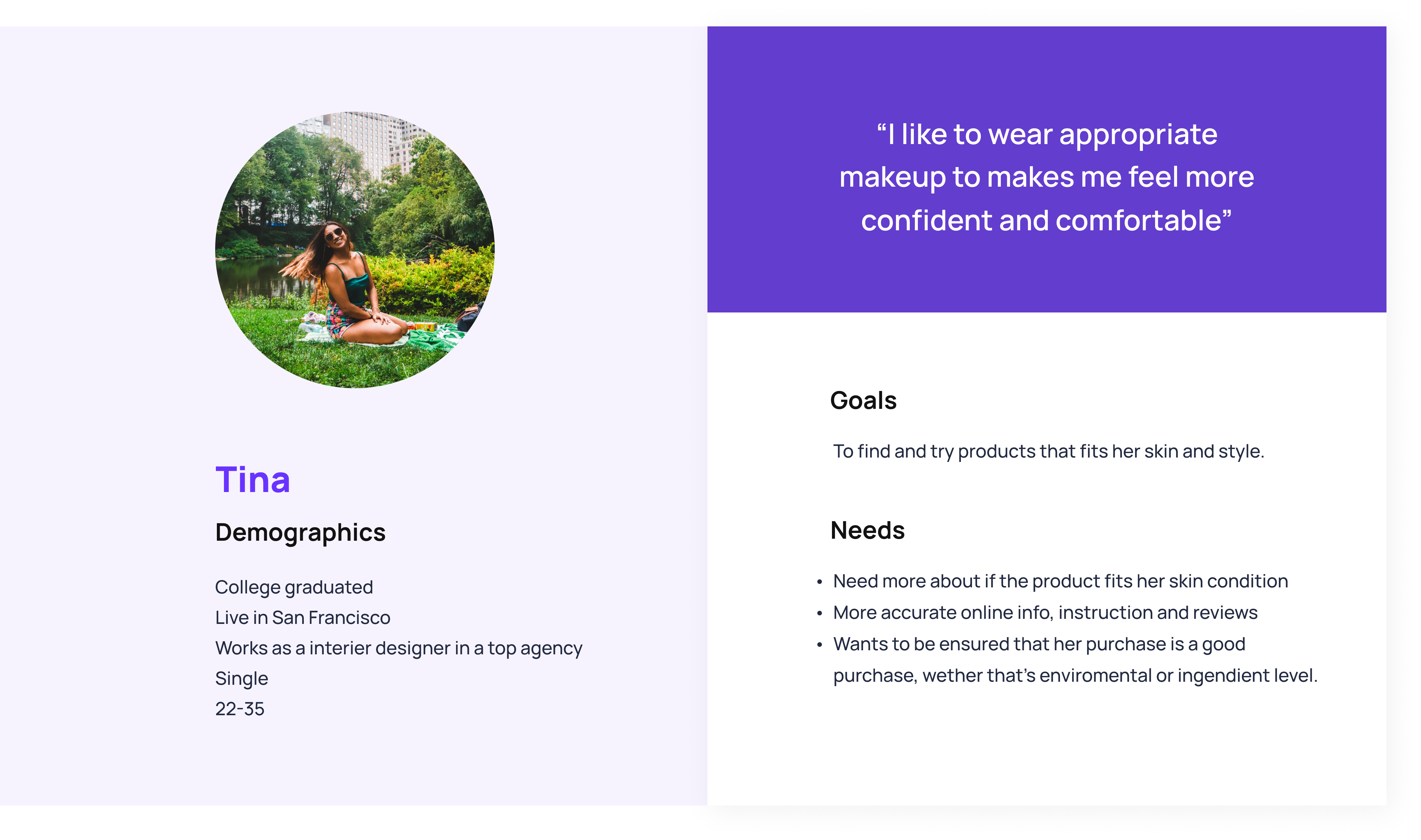 I set the main user group as millennials around 22-35, who cares about their skin and enjoy a high-quality lifestyle. Then I illustrated the persona and the goals & needs.