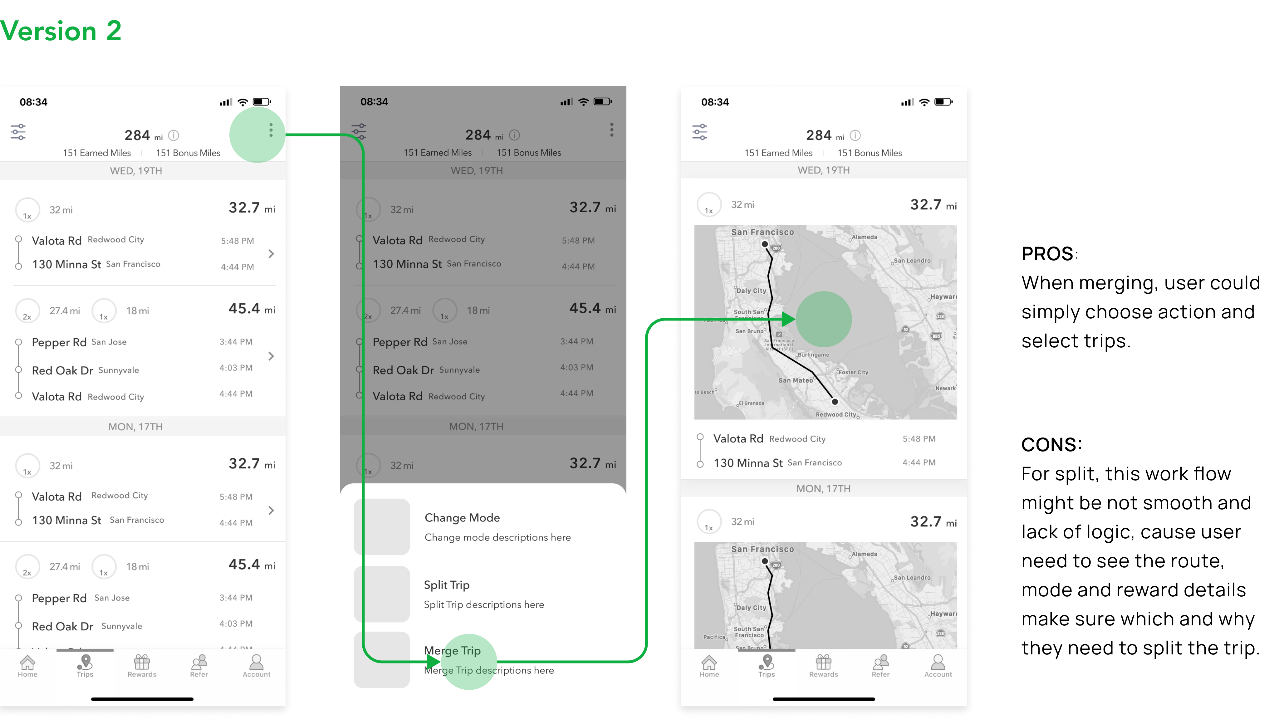 1. From this design challenge, I wanted to help users easily and effectively manage the trips and get better rewarded. I thought by improving the splitting and merging experiences will improve the entire trip experience section and better interact with users that Miles's user base and goals.