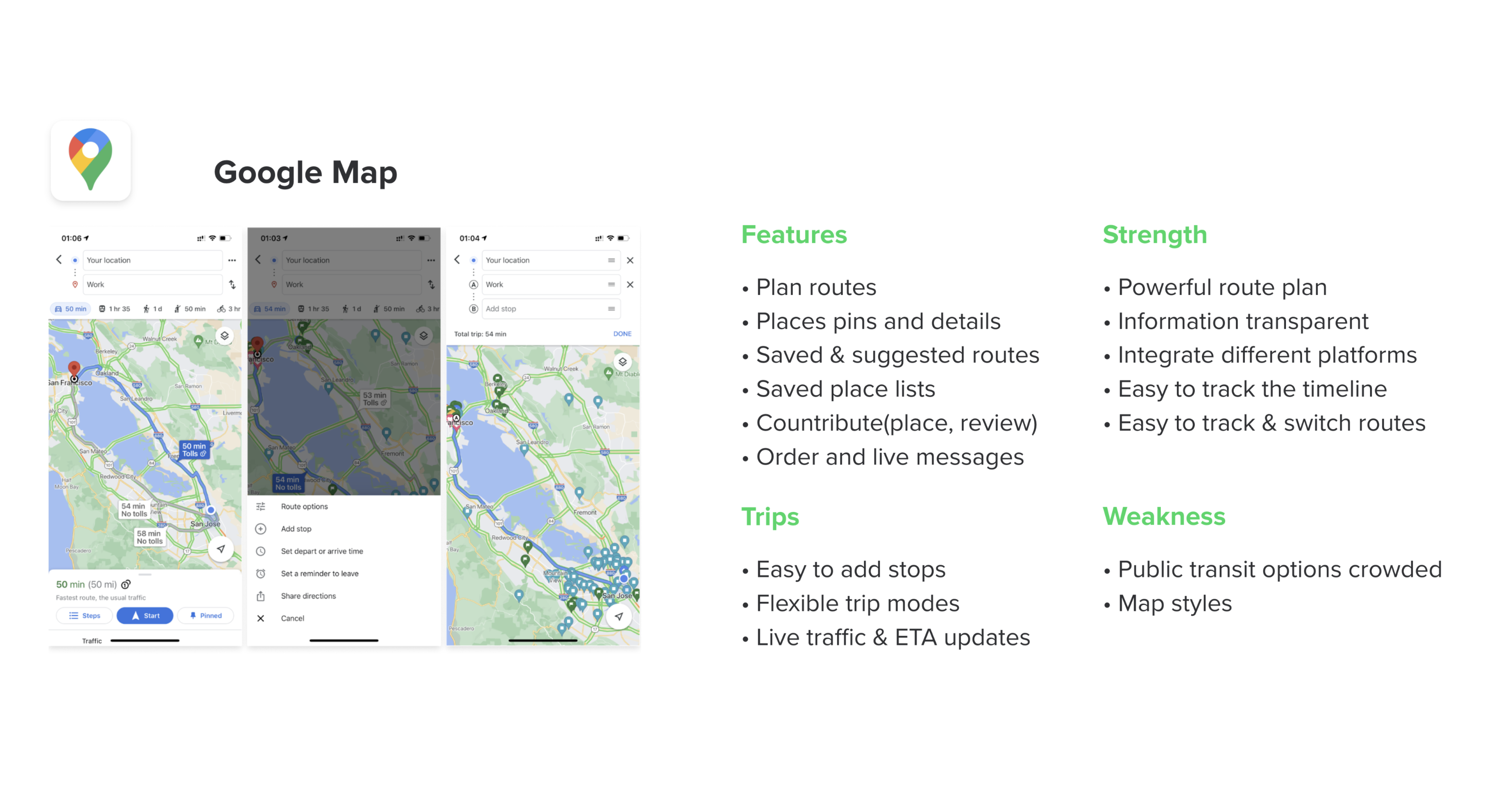 Google map, of course, has a powerful route plan and edit experience. I got a lot of inspirations to try in the next phase of researching competitors.
