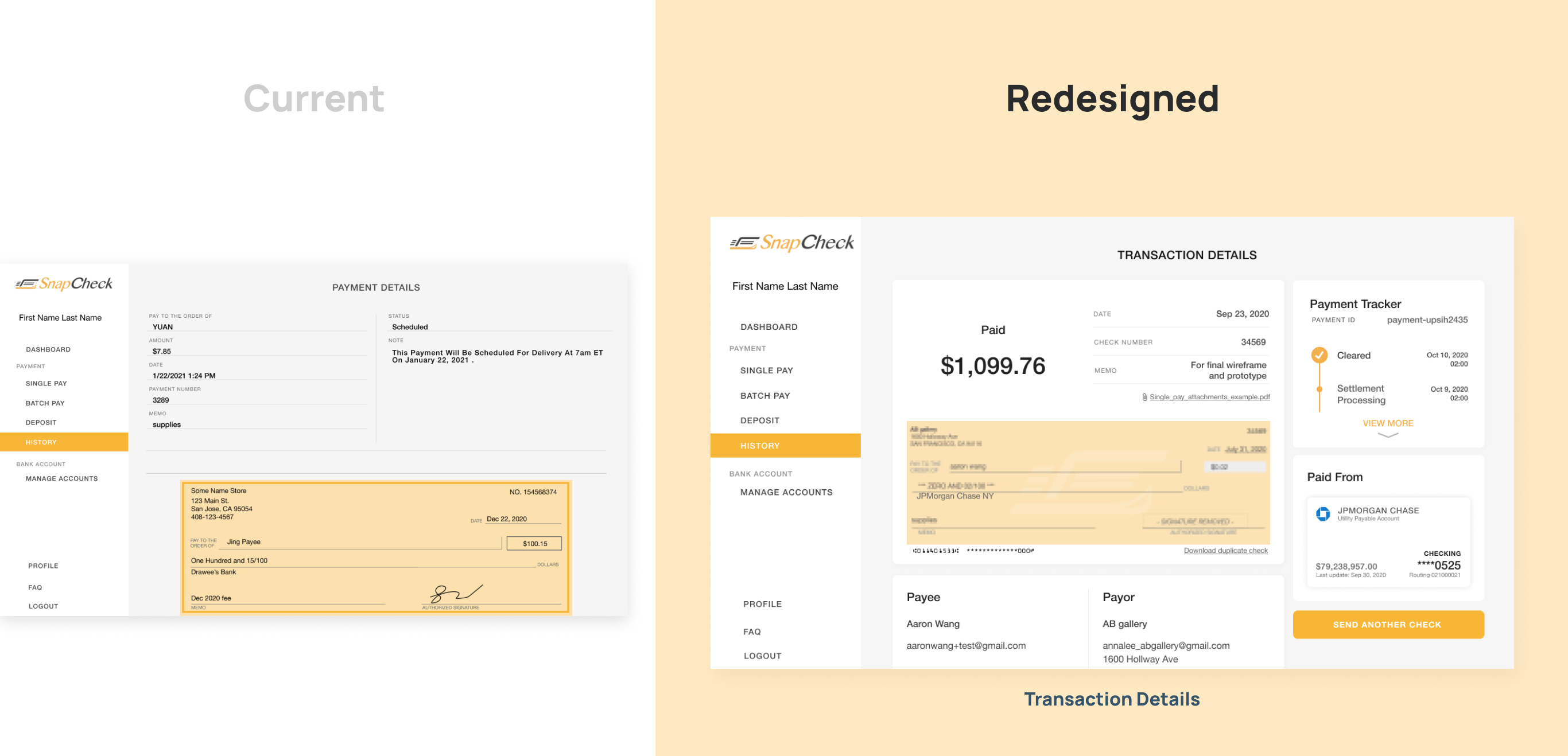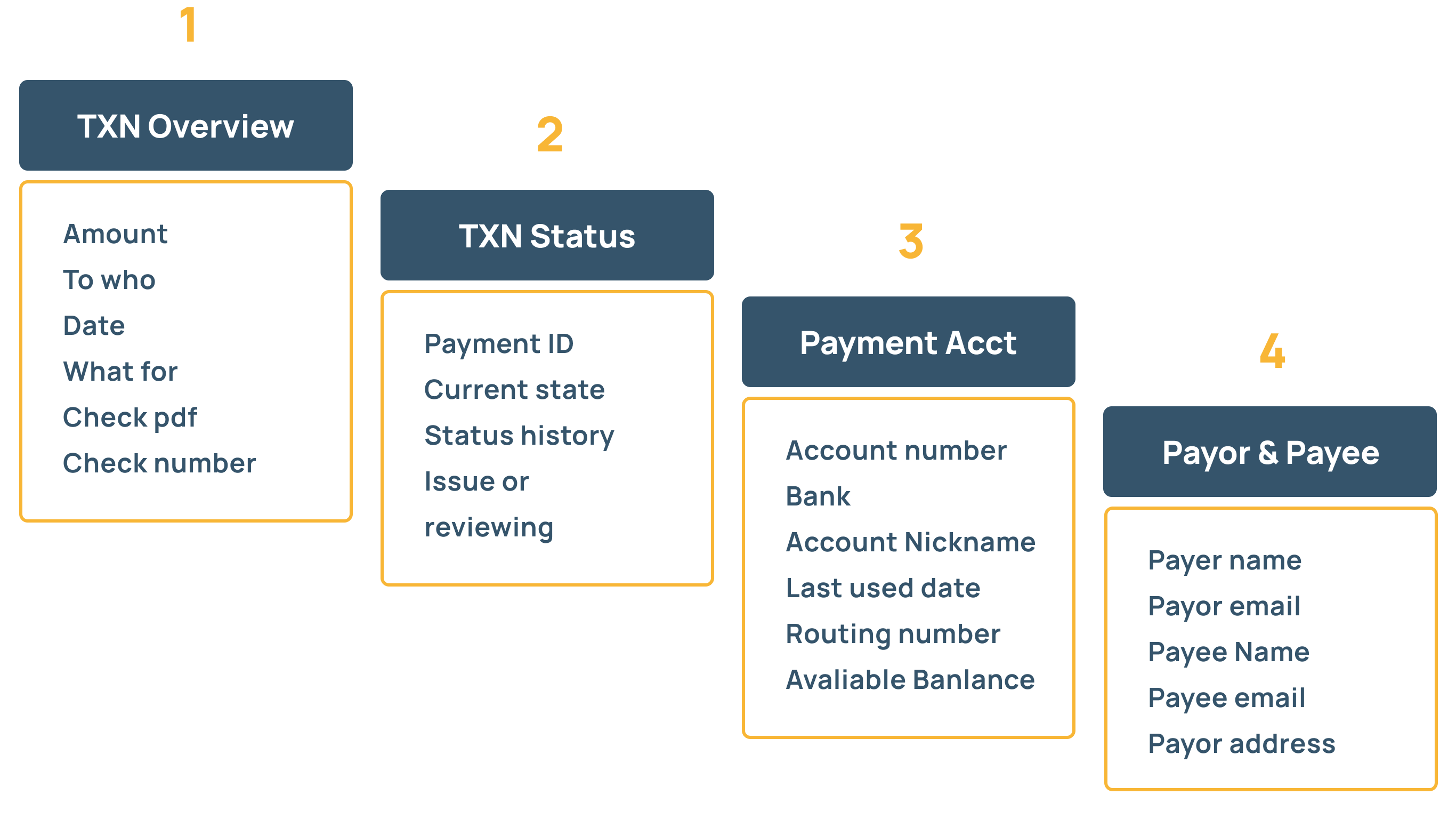 Reorganize the page into four sections(priority top to bottom): Payment info, Payment tracker, Payor & Payee info, and Payment account info.